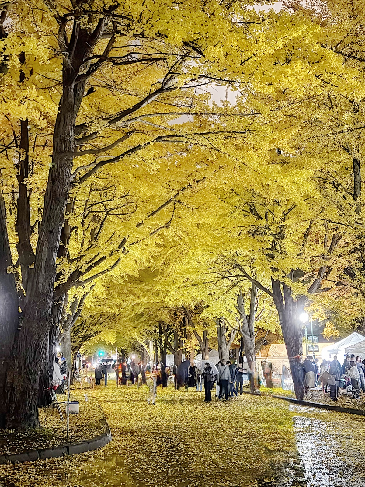 やっと行けたんだけどなー、、、ここね、写真だとそこそこ見頃な銀杏並木ですが、現実は本当に真っ暗で、肉眼じゃぜんぜん見えなかったのよー 笑